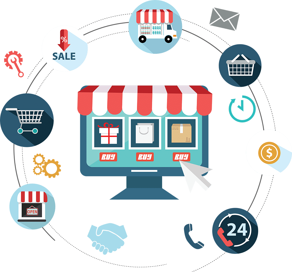 تتمحور البنية الأساسية لمعظم تطبيقات التجارة الإلكترونية حول تبادل الرسائل بين العميل/المستهلك والخادم، ويكون التنسيق على شكل طلب استجابة وفق تسلسل الأحداث، بناء على ذلك تعمل واجهة المستخدم بمثابة جهاز يستقبل الاستعلامات التي يتم معالجتها على مستوى السيرفر، أما التخزين والأمان والتنفيذ والتقدم فتتم جميعها على مستوى خادم تطبيق التجارة الإلكترونية.