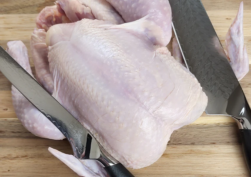 الآن لتسهيل عملية إزالة العظم، يفضل تقطيع الدجاجة إلى أربع قطع كبيرة باستخدم سكينًا حادًا ثم البدء بتقسيمها من منطقة الظهر، ثم يتم فصل الرقبة وقطع الأجنحة.